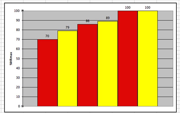 Données comparant les étendues de zone HR d’un groupe de coureurs (colonnes jaunes) et de coureurs (colonnes rouges) et le nombre de points TRIMP à allouer à chaque zone HR