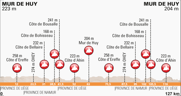 | Mur de Huy | 0.0 | 127.0 | 14h25 | 14h36 | 14h48 | ||